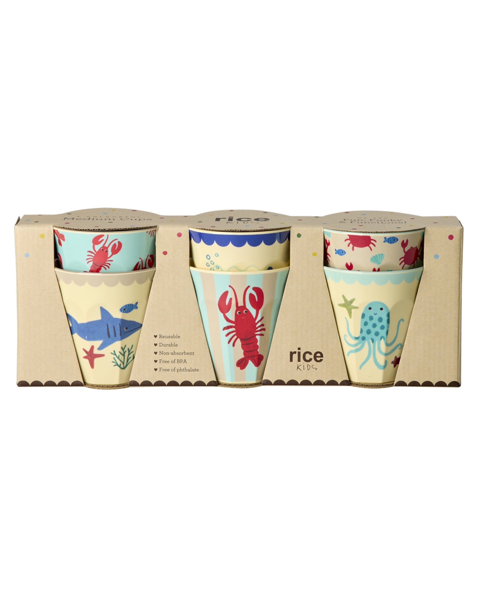 Bereid je voor om verliefd te worden op haaien, vissen, kreeften en alle andere zeedieren die te zien zijn op deze doos met 6 van onze kleine melamine bekers! Melamine is duurzaam en ideaal voor dagelijks gebruik dankzij de stevigheid en eenvoudige reiniging. De bekers zijn superhandig voor zowel kinderen als volwassenen en hebben een inhoud tot 160 ml! Let op: dit product is niet geschikt voor de magnetron.